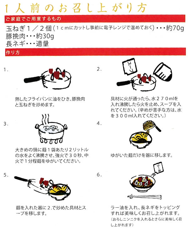 TVでも紹介された人気商品です。 醤油ベースのスープにラー油、玉ネギ・挽肉・長ネギをのせてご賞味ください。