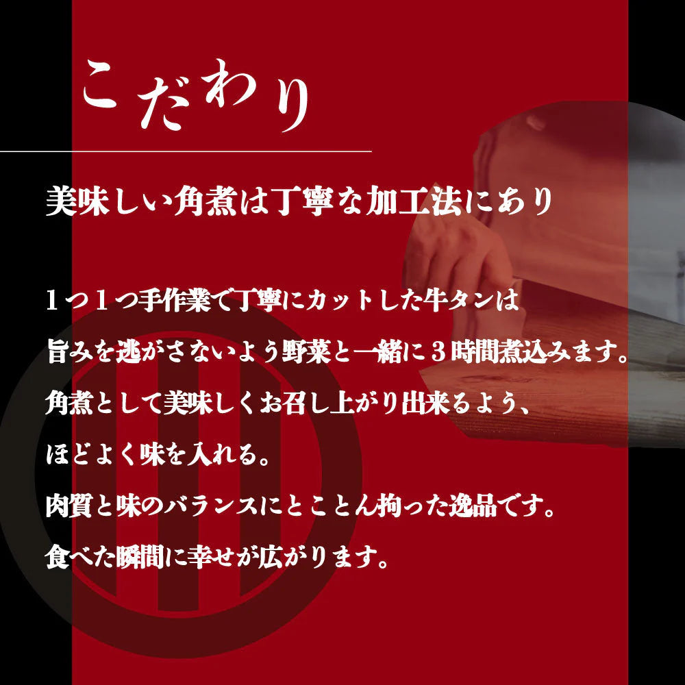 手仕込みでカットした牛タンを、甘辛い醤油で煮たお箸で切れる角煮です。