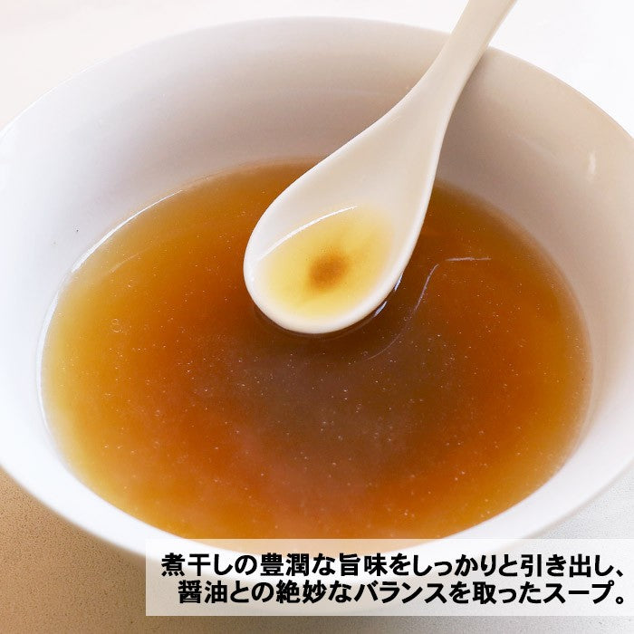 煮干しの豊潤な旨味をしっかりと引き出し、醤油との絶妙なバランスを取ったスープです。