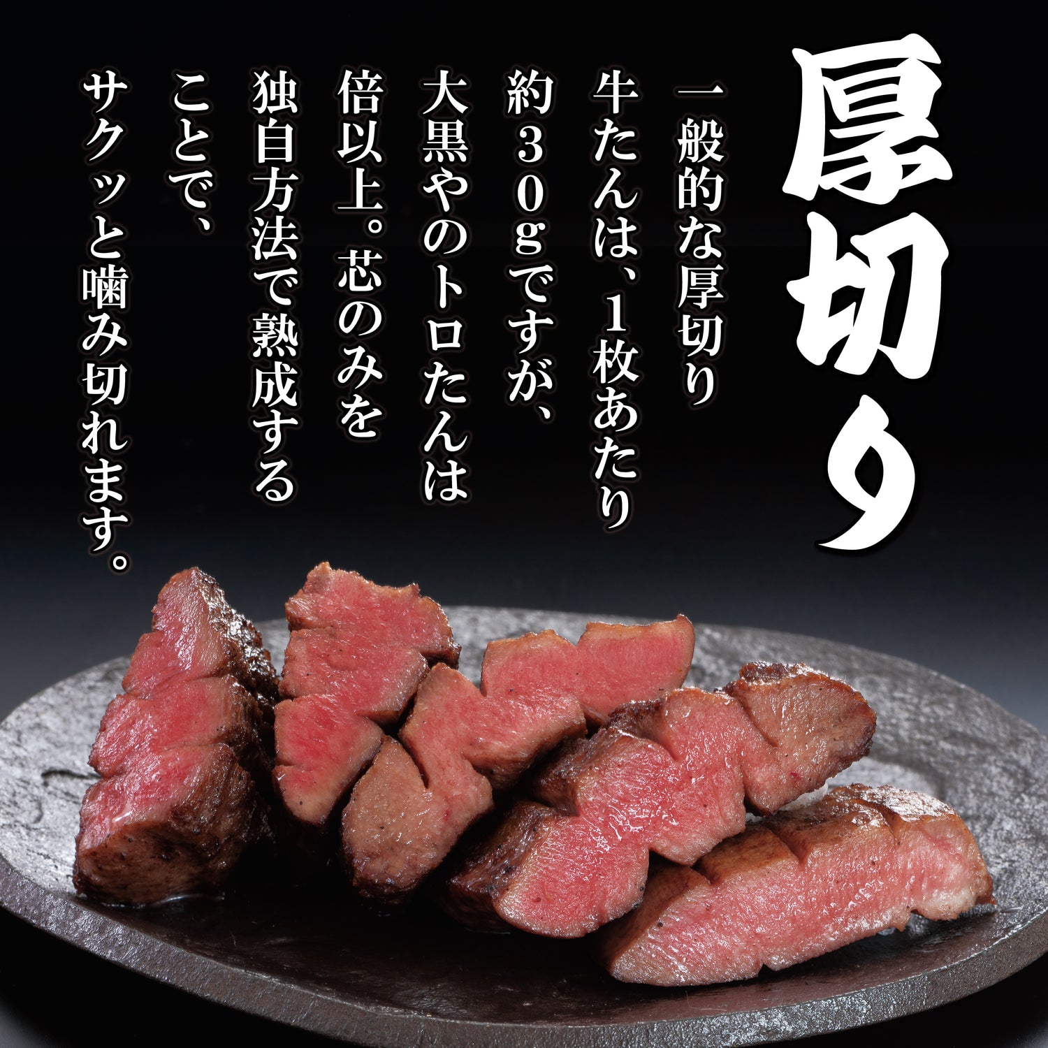 一般的な厚切り牛たんは1枚あたり約30gほどですが、トロたんは倍近くの大きさにカットしています。
