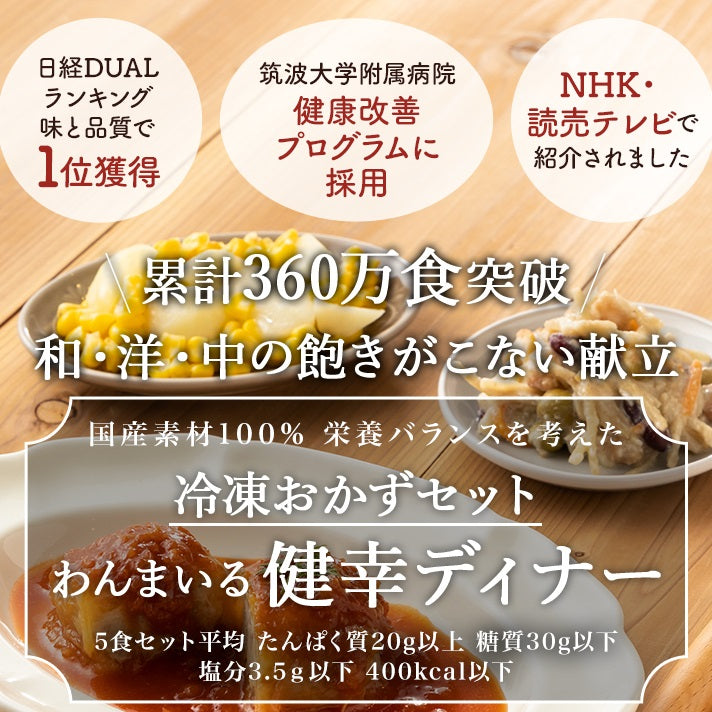 わんまいるの健幸ディナーは、100%国産食材を使用した冷凍おかずセットです。